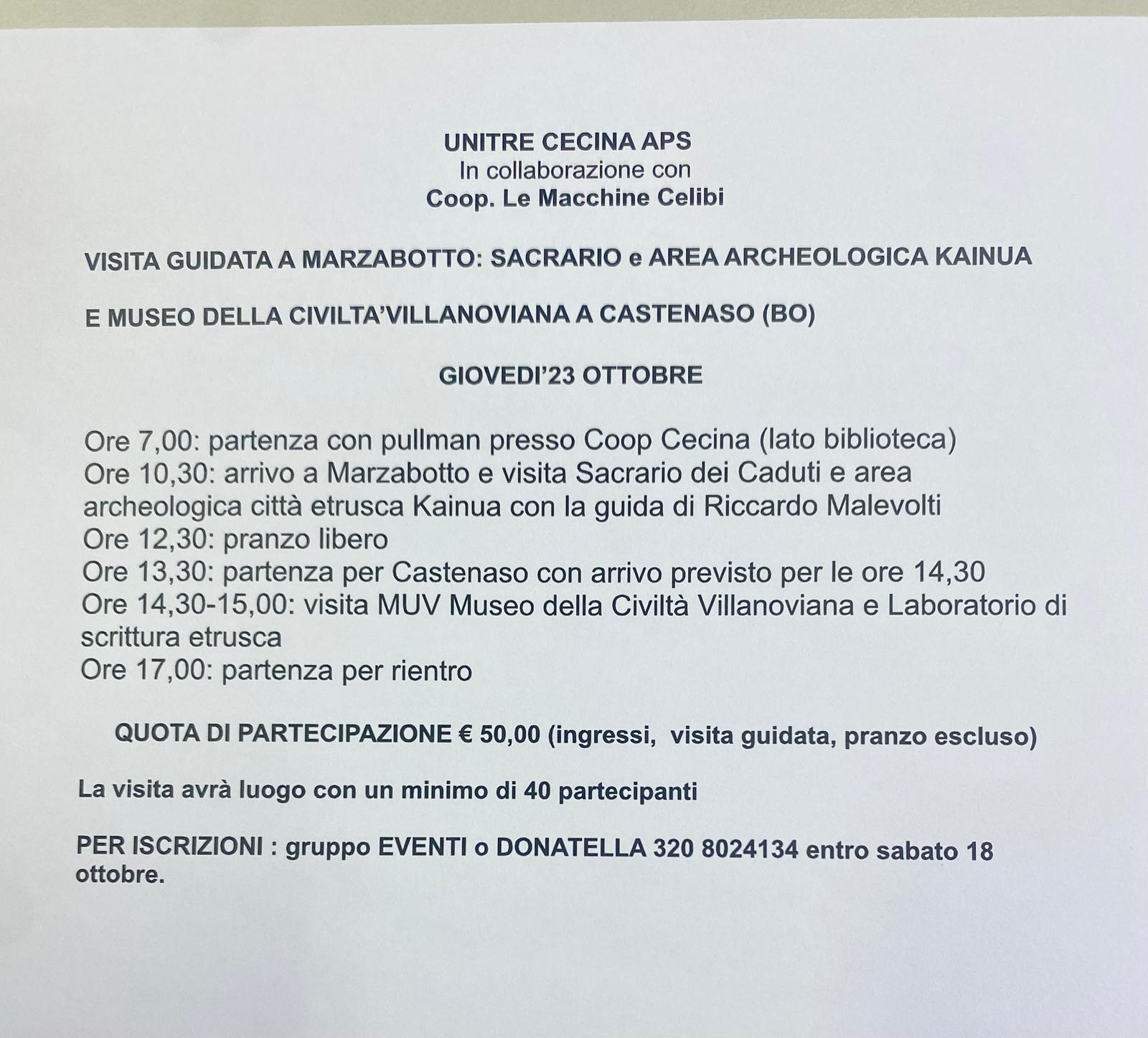 VISITA GUIDATA MARZABOTTO – Giovedi 23 OttobreDi roberto / 7 Ottobre 2025 Visita guidata Marzabotto : Sacrario e area archeologica Kainua e museo della civiltà Villanoviana a Castenaso (BO)….